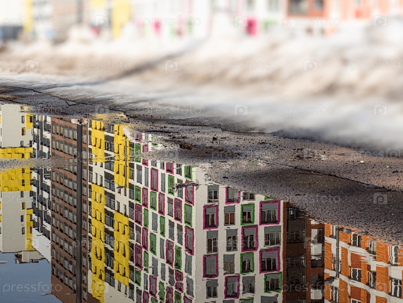 Современные дома отражаются в весенних лужах
