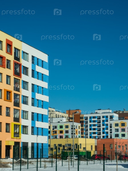 Современный новый дом с красивым ярким фасадом. Москва, Россия