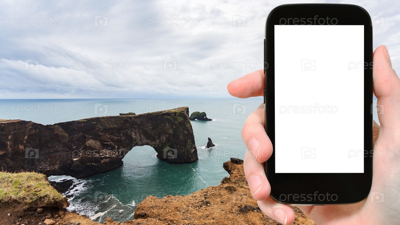 Турист фотографирует скалы Дирхолей в Исландии