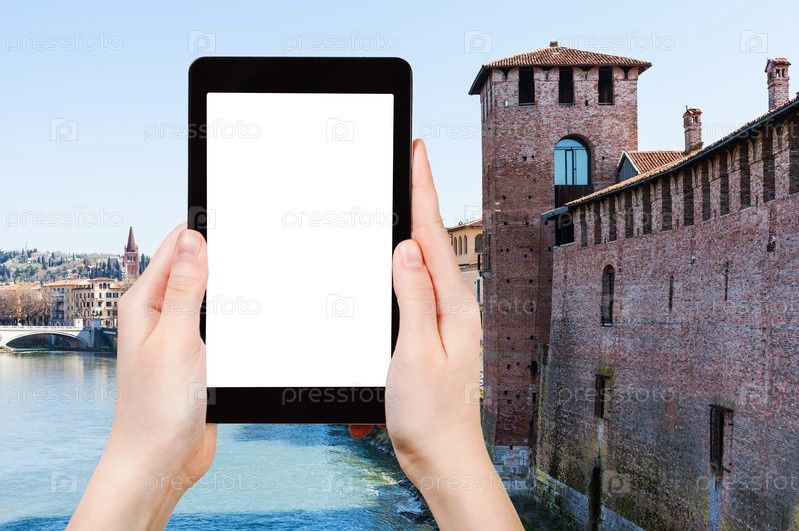 Турист фотографирует город с замком в Вероне