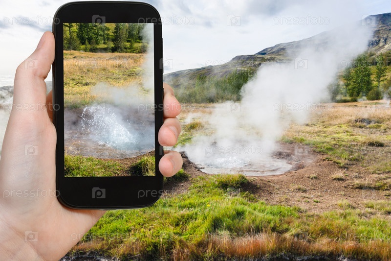 Турист фотографирует гейзеры в Хейкадалюре