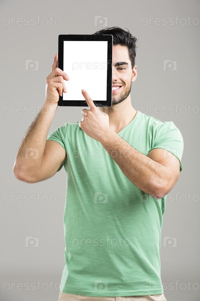 Показывая что-то на планшете