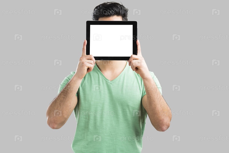 Показывая что-то на планшете