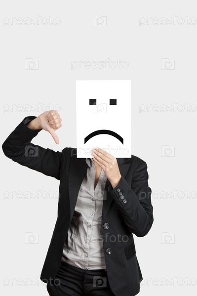 Женщина, показывающая грустный смайлик перед лицом и делающая жестом большого пальца вниз правой рукой