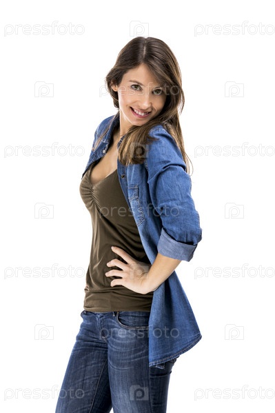 Красивая женщина стоит на белом фоне с руками на бёдрах и улыбается