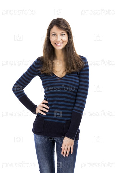 Красивая женщина, улыбающаяся и стоящая на белом фоне