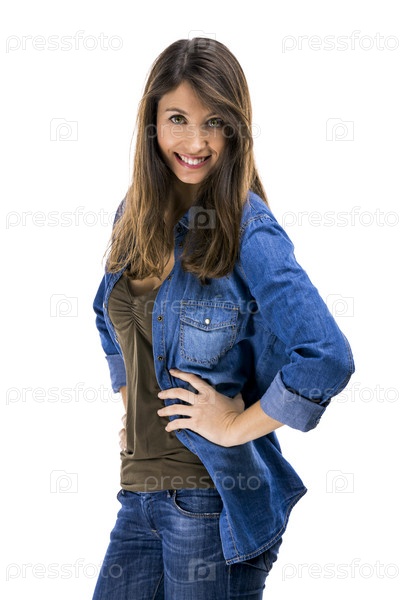 Красивая женщина стоит на белом фоне с руками на бёдрах и улыбается