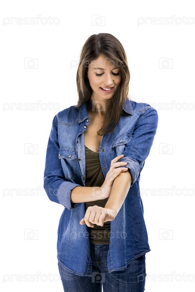 Красивая женщина складывает рукава, изолированная на белом фоне