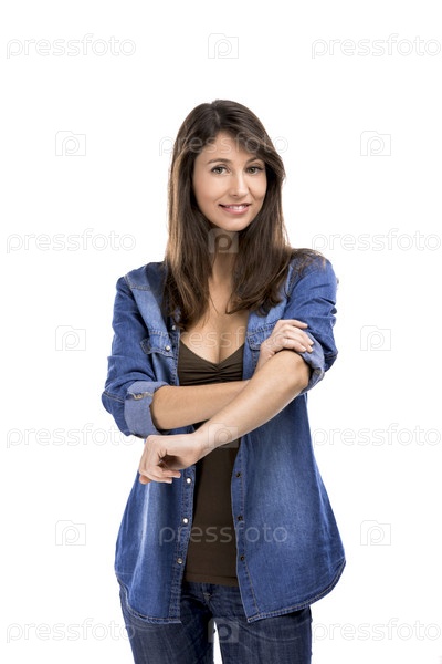 Красивая женщина складывает рукава, изолированная на белом фоне