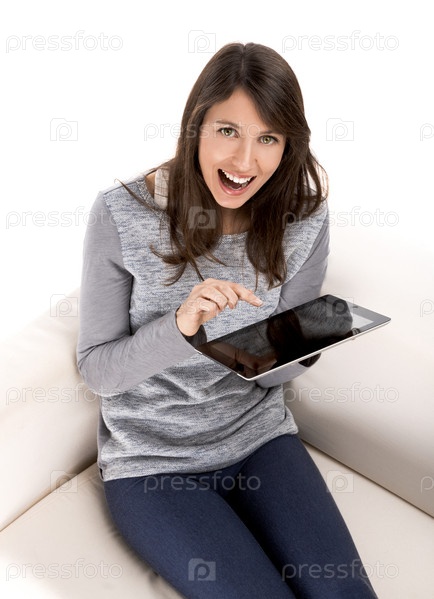 Красивая женщина, сидящая на газировке и работающая с планшетом