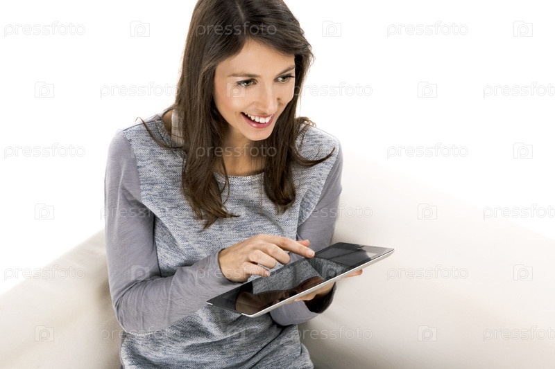 Красивая женщина, сидящая на газировке и работающая с планшетом