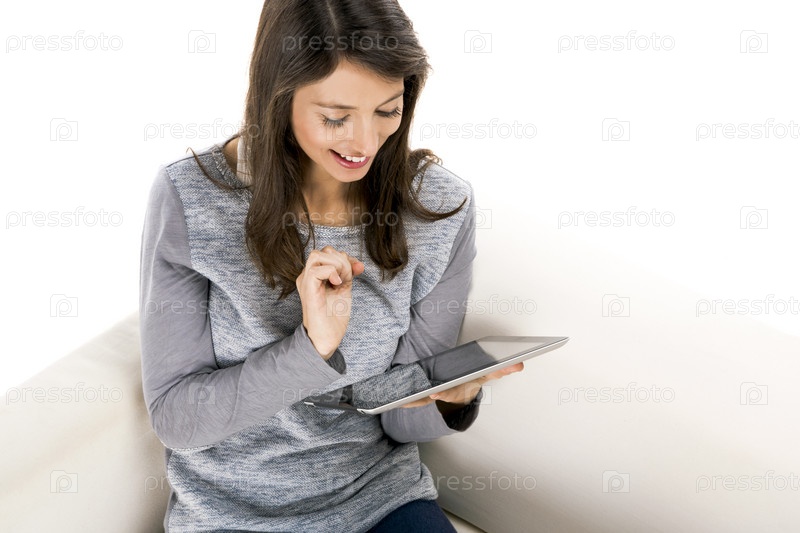 Красивая женщина, сидящая на газировке и работающая с планшетом