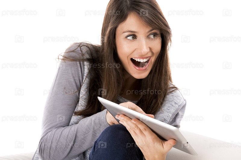 Красивая женщина, сидящая на газировке и работающая с планшетом