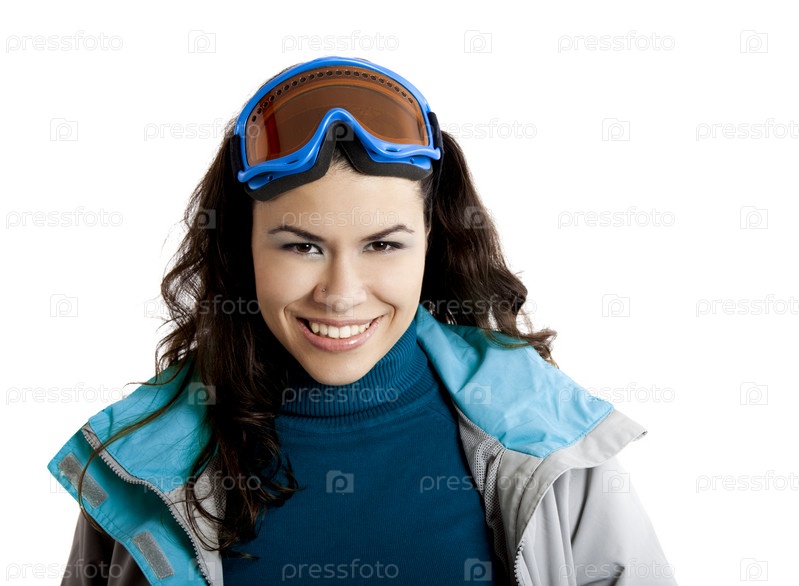 Портрет красивой молодой девушки в зимнем пальто и снежных очках