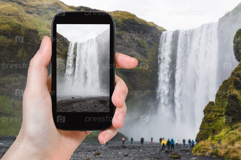 Турист фотографирует водопад в Исландии