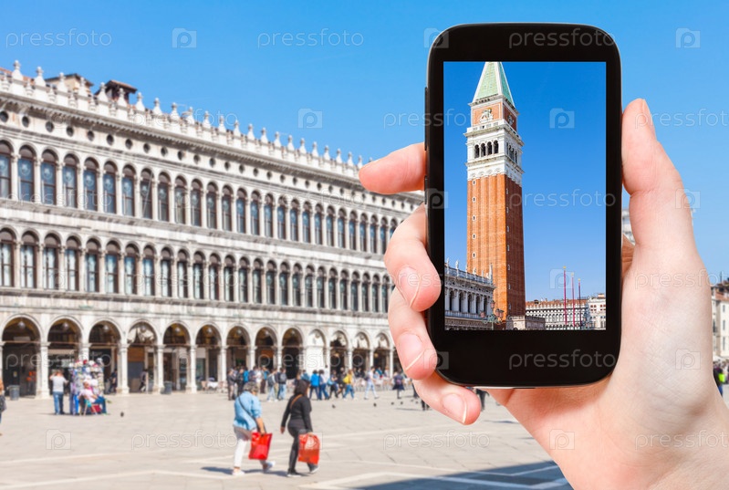 Турист фотографирует колокольню и дворец Дожей