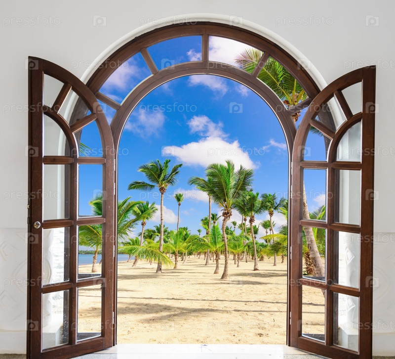 Дверь открыта на пальмовом пляже