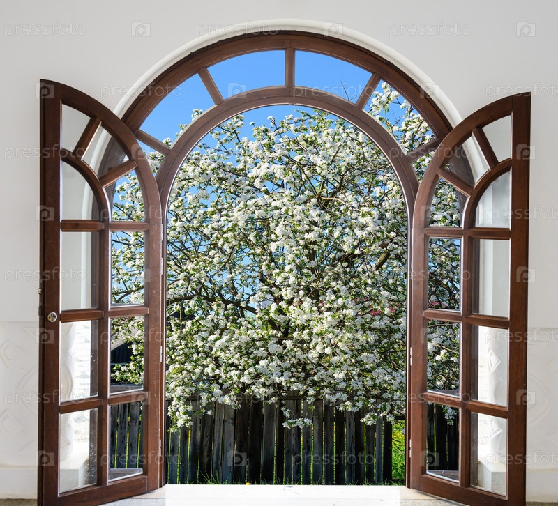 Открытая дверь арка сад цветет весной