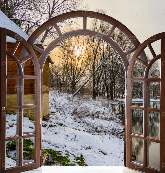 Открытые арочные двери с видом на природный ландшафт