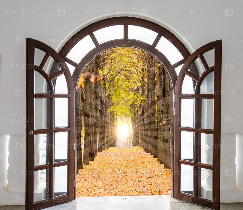 Открытая дверь с видом на зеленую лугу, освещенную ярким солнечным светом
