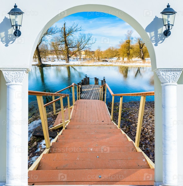 Дверная арка с фонарем в виде лестницы к пруду