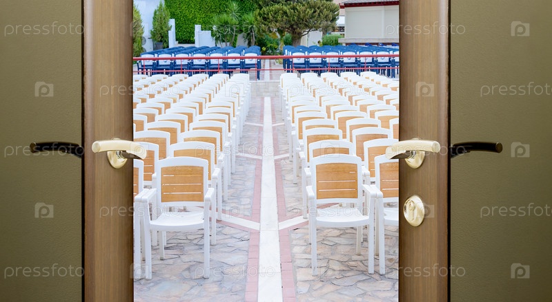 Перед собой ряд мест в концертном зале с открытой дверью