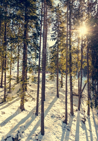 Горный пейзаж в солнечный зимний морозный день с голубым ясным небом