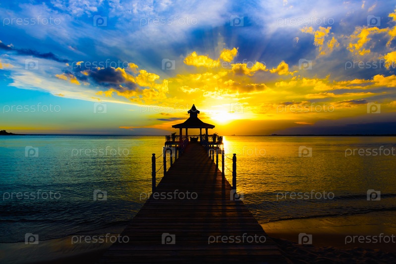 Мост из беседки на море при закате