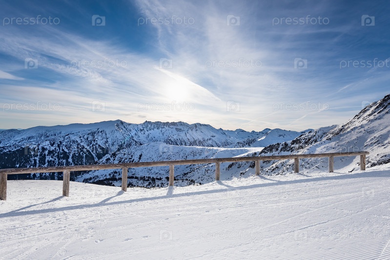 Горные вершины, покрытые снегом, освещены ярким солнцем