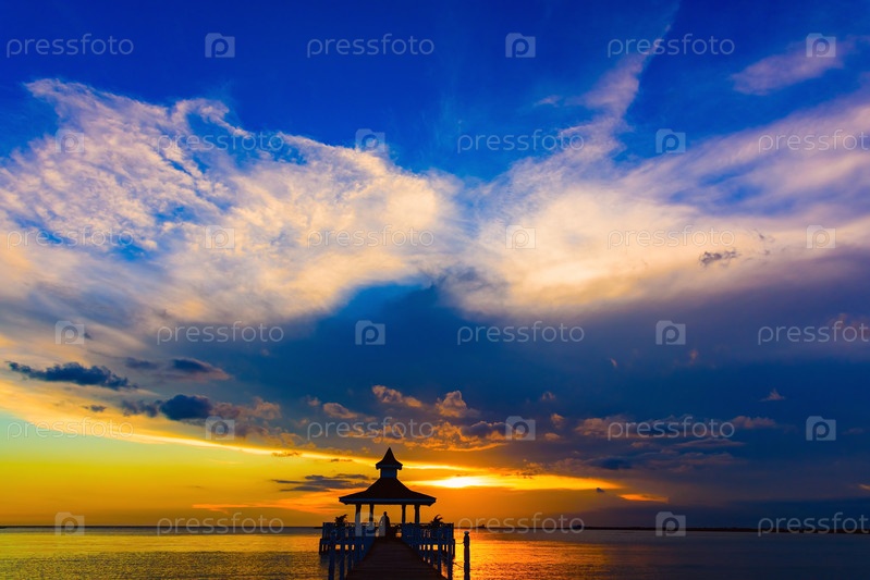 Мост из беседки на море при закате