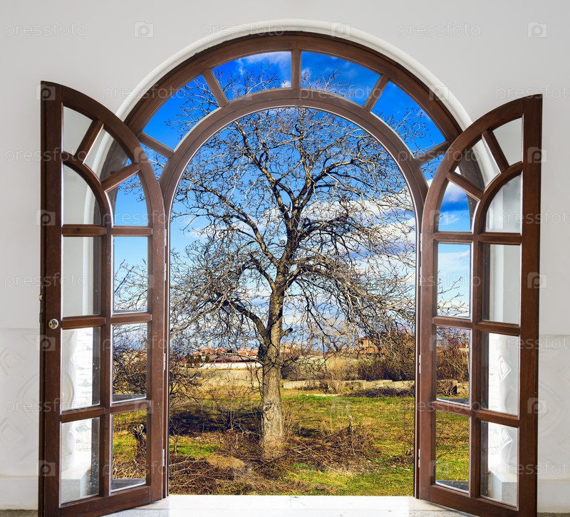 Открытая дверь арка сад цветет весной