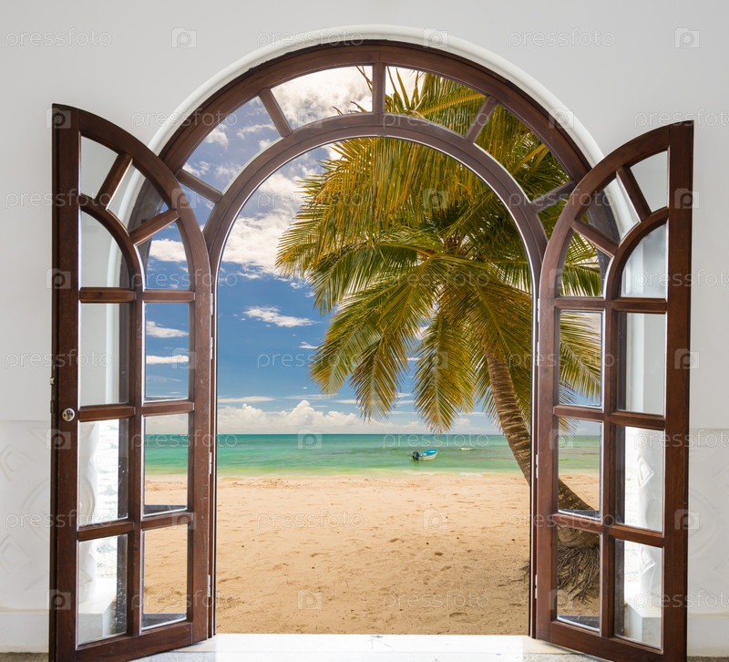 Деревянные открытые двери с аркой выхода на пляж