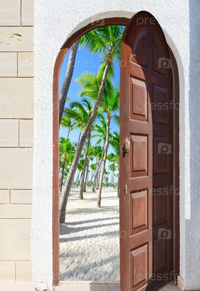 Дверь открыта на пальмовом пляже