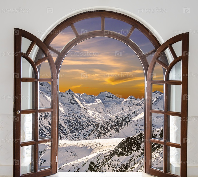 Арковая дверь открывалась с видом на вершины снежных гор и закат солнца
