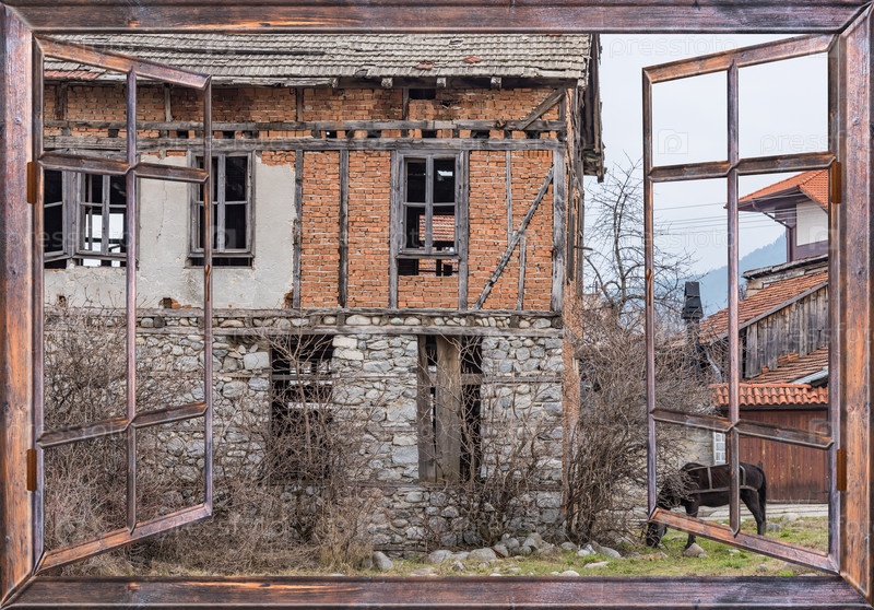 Старый деревенский дом с видом на лошадей из окна