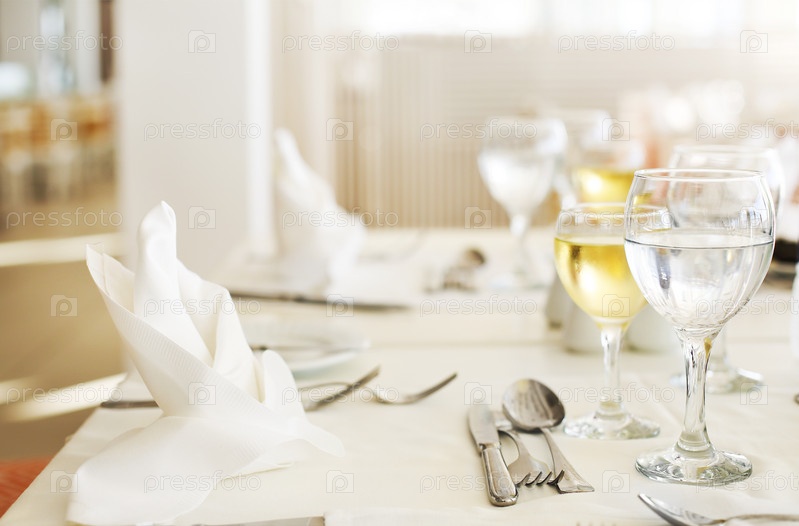 Бокалы и тарелки на столах