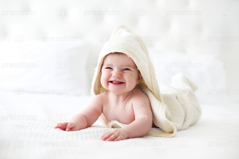 Шестимесячный ребенок носит полотенце после ванны