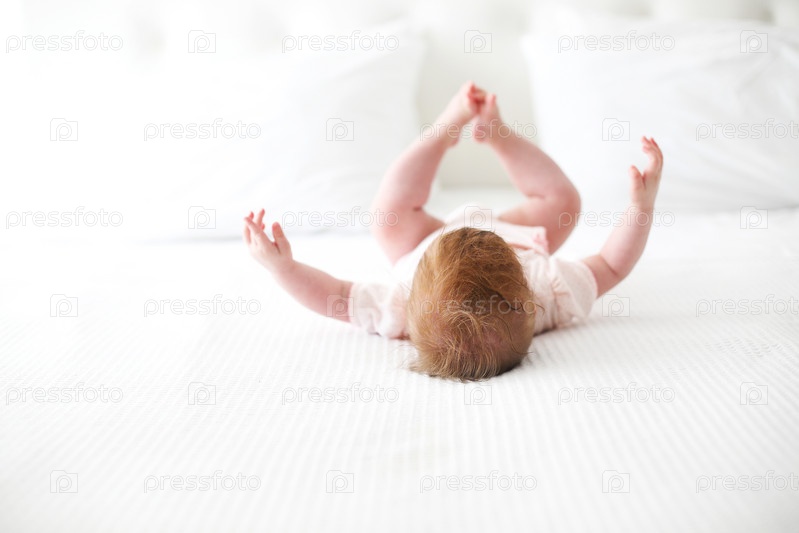 Шестимесячный ребенок играет на кровати