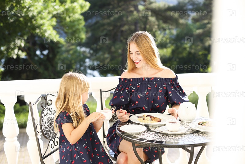 Веселые мать и дочь сидят в кафе на открытом воздухе, пьют чай с десертами и смеются вместе