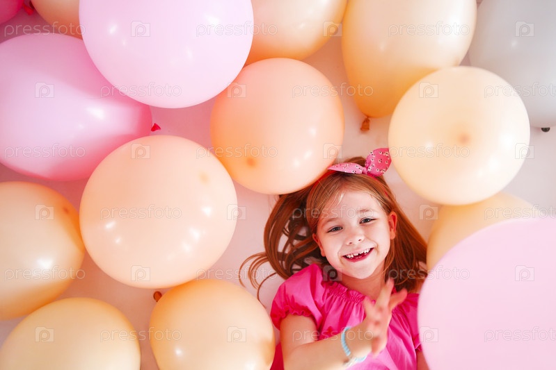Портрет милой маленькой девочки в ретро-стиле на фоне воздушных шаров