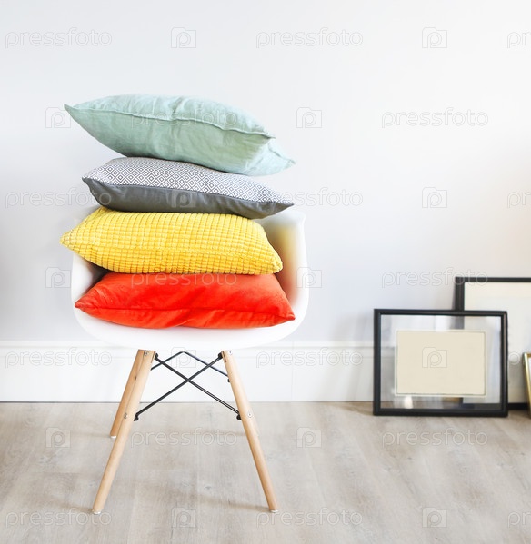 Стул в интерьере с подушками в модных цветах