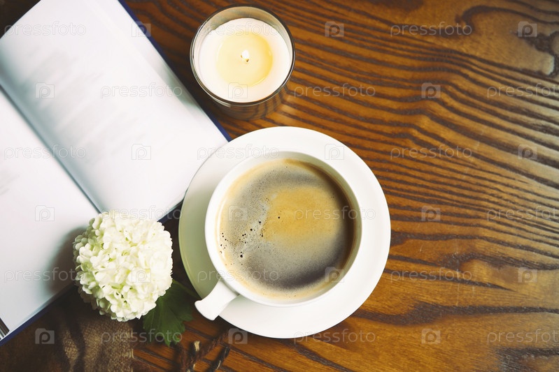 Кофе, книга, колокольчик и свеча дома