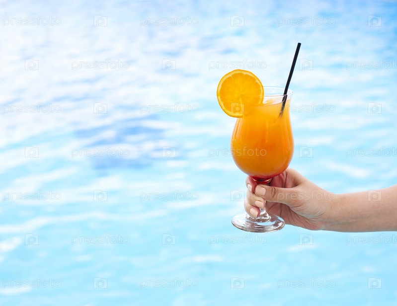 Стакан тропического коктейля у бассейна