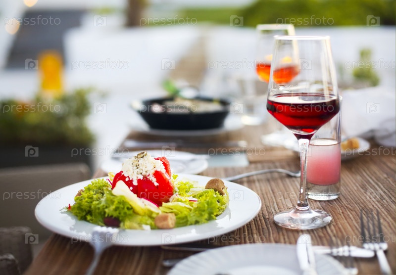 Ужин с овощным салатами и красным вином