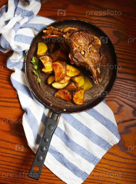 Жареное козьё мясо с соусом и жареным картофелем в сковороде