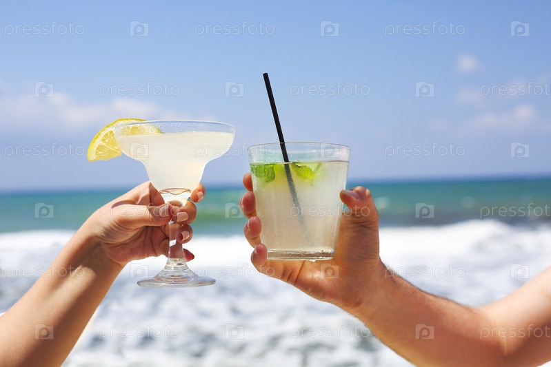 Два бокала для коктейлей в руках мужчины и женщины