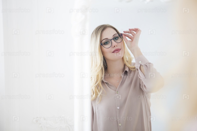 Гламурная молодая блондинка, улыбающаяся женщина в очках