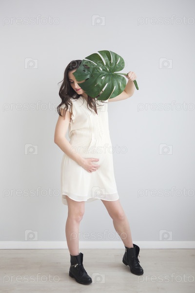 Брюнетка беременная женщина, держащая лист монстеры