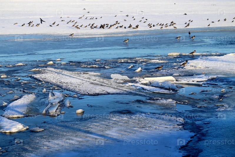 Стая ворон на льдинах реки