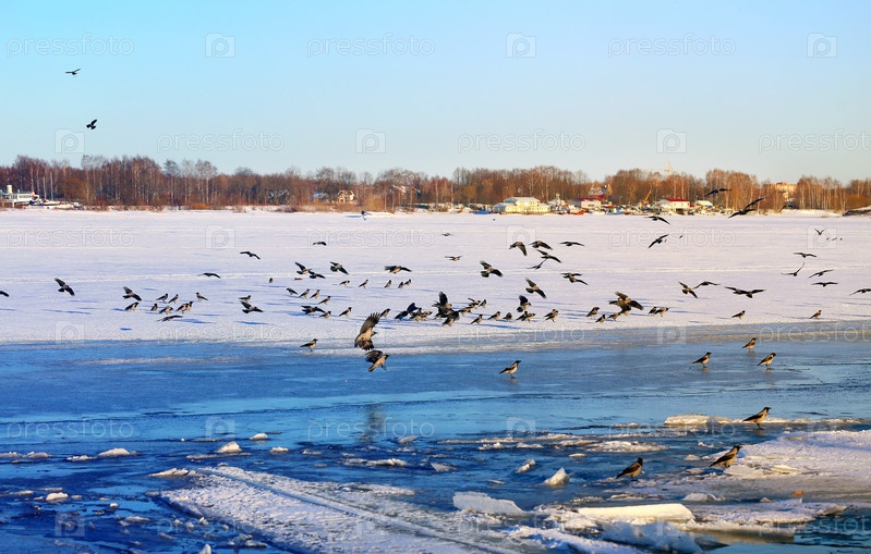 Стая ворон на льдинах реки